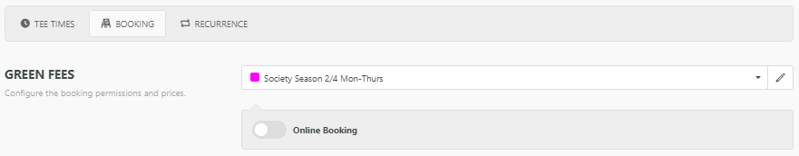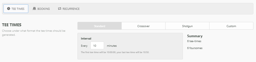 - Tee times: Choose between a standard, crossover, shotgun, or custom start.