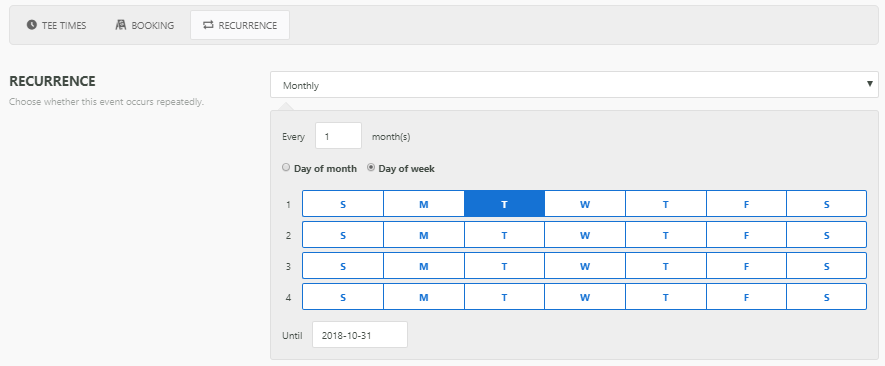 In the example below, we have chosen a monthly event that recurs on the first Tuesday of each month for one year.