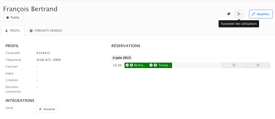 - Cliquez sur ''fusionner des utilisateurs'' (bouton en haut à droite de la fiche client)